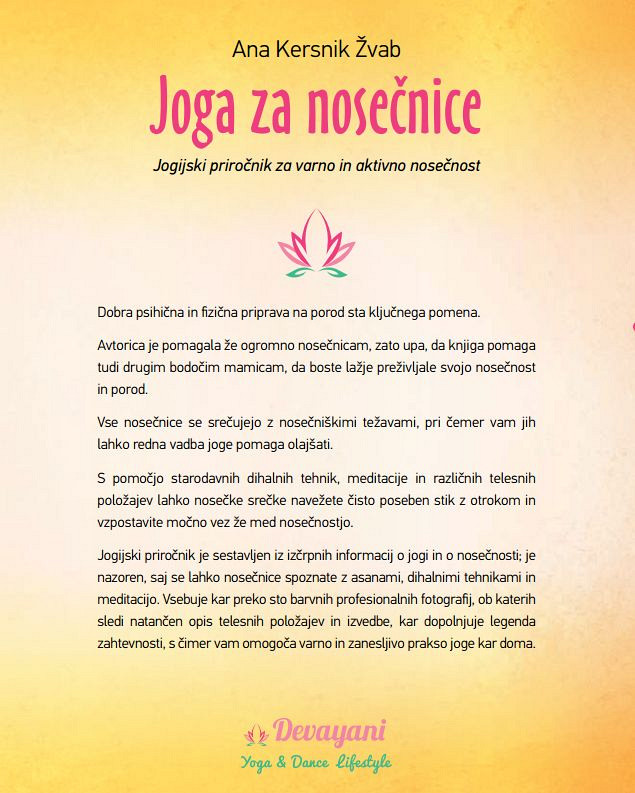 Ana Kersnik Žvab, znana tudi kot Ana Devayani Kersnik Žvab, je mednarodno priznana jogistka z večletnimi izkušnjami v jogi kot izvajalka, mentorica in inštruktorica. Svojo licenco je pridobila v Indiji (International Yoga Teacher), a se redno udeležuje izobraževanj, delavnic in tečajev v Sloveniji in tujini, od Amerike, Portugalske, Španije, do Avstrije, Hrvaške itd. Joga je njena strast, ni le njen poklic, ampak tudi njen način življenja. Kot vaditeljica aerobike, pilatesa, plesalka in inštruktorica joge ve, kako pomembno je ohranjati svojo vitalnost, zdravje in postavo. V vlogi mamice pa je ugotovila, da za mlade mamice ni kaj dosti gradiva o jogi za nosečnice, zato je iz pisanja člankov sklenila združiti svojo ljubezen do materinstva in joge ter svoje znanje in izkušnje deliti tudi z drugimi mamicami. Kot sociologinja kulture in rusistka je preko množične objave člankov prešla na objavo svoje prve knjige, ki jo posveča vsem mamicam.