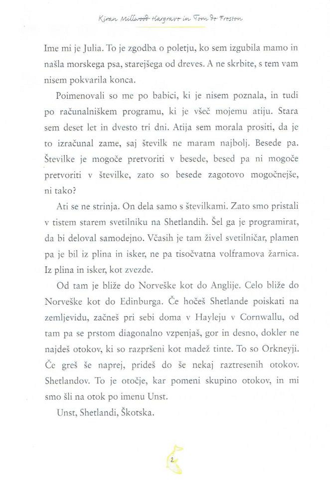 Poimenovali so me po babici, ki je nisem poznala, in tudi po računalniškem programu, ki je všeč mojemu atiju. Stara sem deset let in dvesto tri dni. Atija sem morala prositi, da je to izračunal zame, saj številk ne maram najbolj. Besede pa. Številke je mogoče pretvoriti v besede, besed pa ni mogoče pretvoriti v številke, zato so besede zagotovo mogočnejše, ni tako?