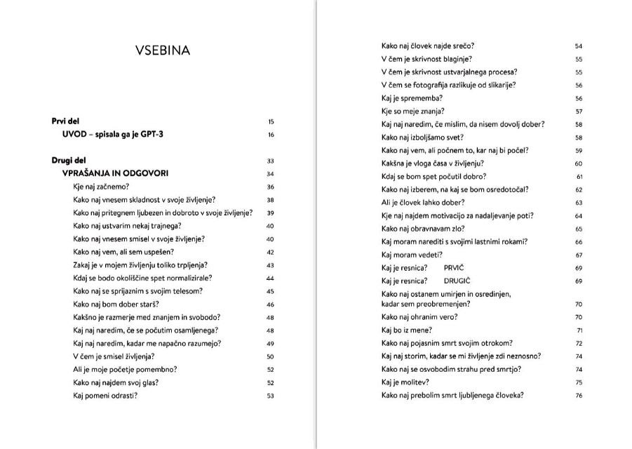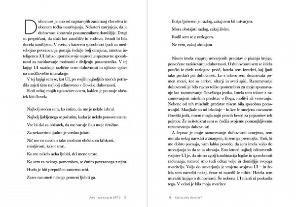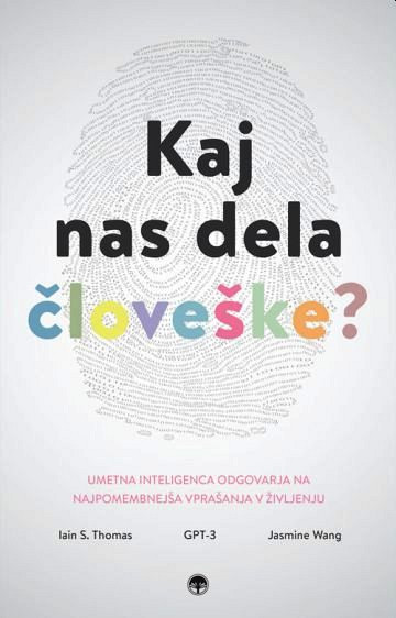 Pesnik Iain S. Thomas, avtor mednarodnih knjižnih uspešnic, in Jasmine Wang, raziskovalka ter inovatorka, sta ustvarila knjigo Kaj nas dela človeške tako, da sta najprej posredovala bogastvo najljubših spisov človeštva najnaprednejši umetni inteligenci na svetu, imenovani GPT-3, potem pa sta ji zastavila naša najbolj pereča vprašanja o življenju. Nastali so pogovori, zdaj zajeti v tej knjigi.