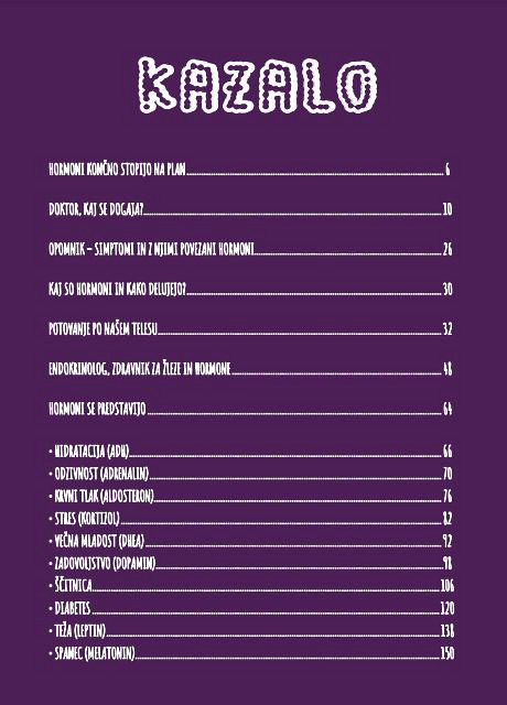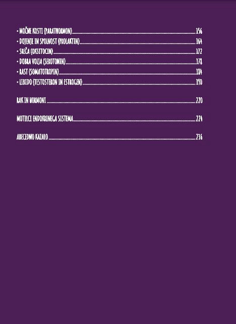 Čaka nas torej ogromno dela, zato vam knjiga za začetek predstavlja 18 najpomembnejših hormonov, ki jih morda poznate po imenu, medtem ko njihova vloga in vpliv na naše življenje ostajata skrivnost.