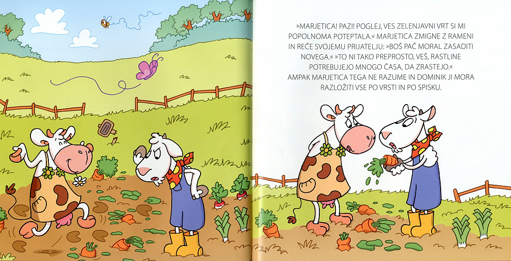 "Marjetica! Pazi! Poglej, ves zelenjavni vrt si mi popolnoma poteptala." Marjetica zmigne z rameni in reče svojemu prijatelju: "Boš pač moral zasaditi novega."