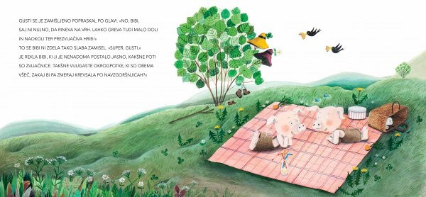 "Pujsa sta stala sta pod vznožjem grička nedaleč od njune hišice in zrla navzgor. Bil je eden tistih prijaznih puhastih gričkov, ki so videti kakor usločen mačji hrbet, preden se spusti proti tlom. Do izhodišča je šlo zlahka. Morala sta prebresti potoček, prečkati travnik in se nazadnje oprezno splaziti pod vejami mladega drevesa. Danes sta bila trdno odločena, da bosta premagala hrib."