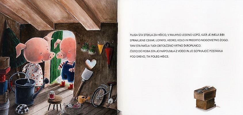 Mizo bi resda lahko postavila na vrt, ampak na njem že od zgodnje pomladi razgrajata dva škorca, ki se nikakor ne pustita odgnati. Pujsoma tako ne preostane drugega, kot da se domislita imenitne rešitve: hišico bosta pošteno zalila z vodo, da bo zrasla ...