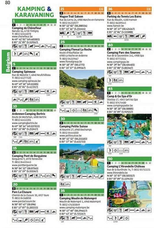 Vodnik je organiziran po državah, kampi in postajališča so v ločenih barvah vrisani v zemljevide. Poleg kontaktnih informacij so navedeni najnovejši podatki o ceni prenočitve, sezoni obratovanja, GPS lokaciji in dodatni ponudbi ter vsebinah, ki jih nudi kamp oziroma postajališče.