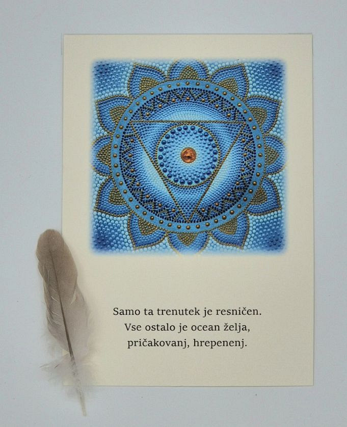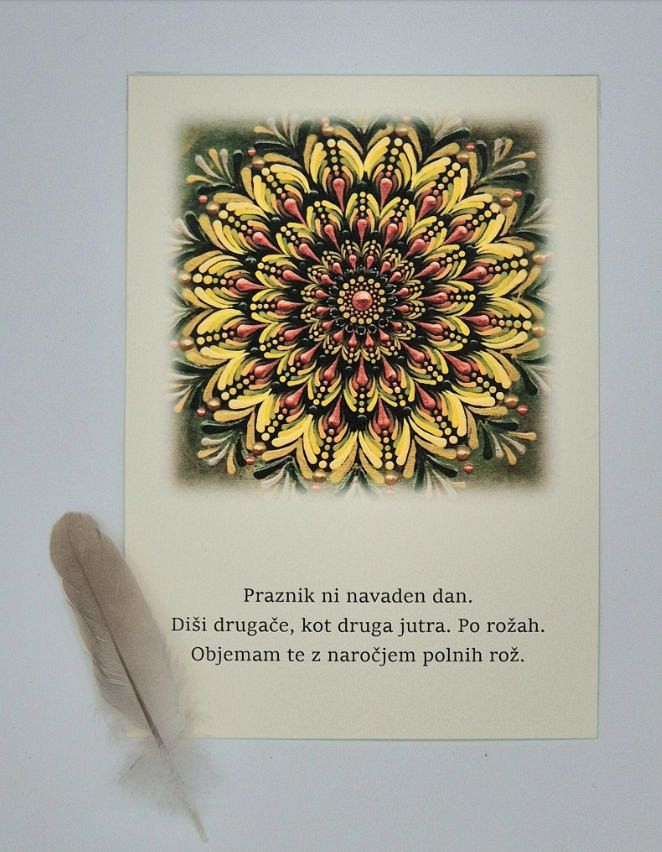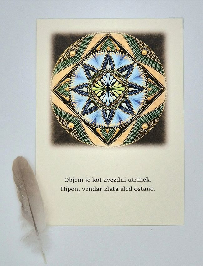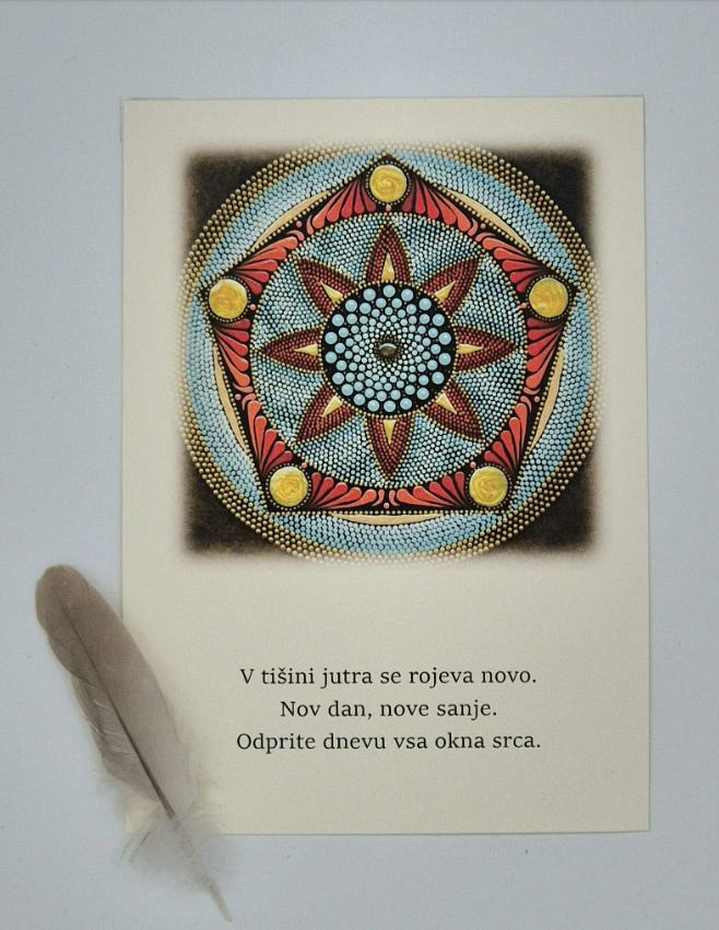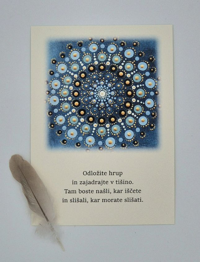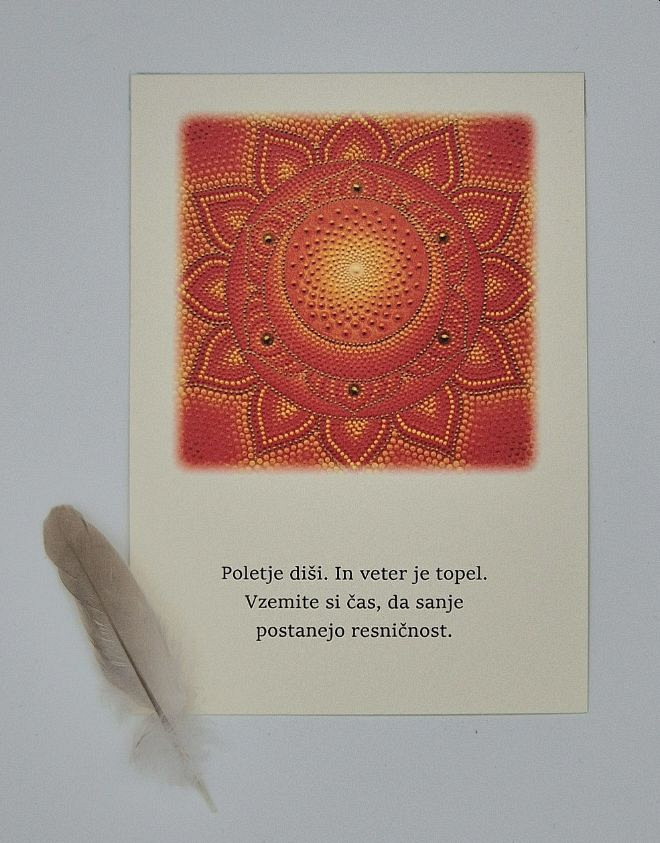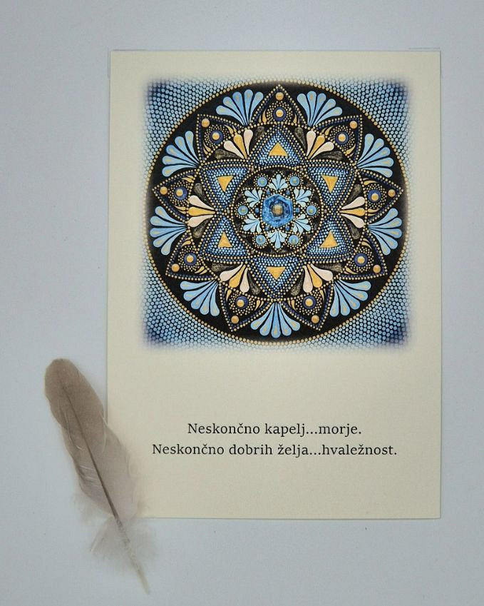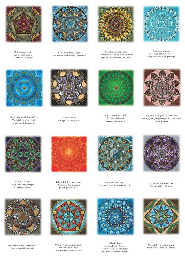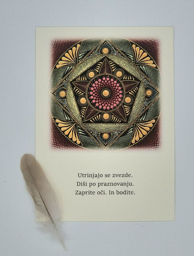 Oblike, barve in besede imajo svojo frekvenco, s katero lahko vplivamo na naše boljše počutje, razpoloženje, energijo prostora… Na kartolinah Čarne srčnice sva uravnotežili frekvence mandal in kratkih besedil – lepih misli navdiha. Oblikovali sva jih z odgovornostjo in iskreno željo, da vam prinesejo darove Dobrega: zdravje, mir, srečo, ljubezen, navdih, obilje, radost, prijaznost, sočutje, blagost… Da vas objamejo s toplino in vam polepšajo trenutek, dan.