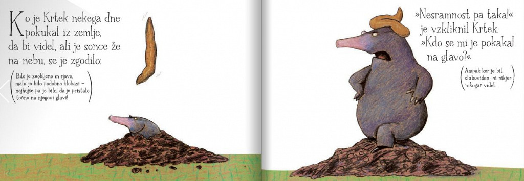 Ko je Krtek nekega dne pokukal iz zemlje, je na njegovi glavi pristalo nekaj zaobljenega in rjavega, podobnega klobasi … Podal se je na detektivski lov v iskanju storilca, ki se mu je pokakal na glavo …