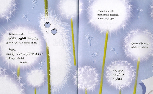 Hej, ti! Ja, ti! Dobro poglej!Si videl puhasto belo gosenico Frido?Si jo videl?Hočem jo za kosilo!Nisi?Si prepričan?Potem pa...Kje je Frida?Trda vezava, 25 x 28 cm, 30 strani.