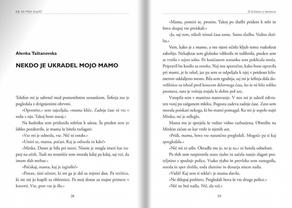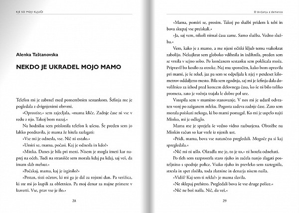 »Nisem vedela, zakaj je bil Jaša, moj mož in takrat poslanec v državnem zboru, večkrat žalosten, zaskrbljen, a ni znal povedati, kaj mu je. Tudi jaz nisem vedela, kaj se dogaja, in nisem imela nikogar, s komer bi se lahko pogovorila. Ko sva končno izvedela za bolezen, se o njej nisva znala pogovarjati. To je bilo leta 2000, in če bi takrat dobila v roke takšno knjigo, bi nam vsem bilo dosti lažje.« - Štefanija Lukič Zlobec, predsednica Združenja Spominčica – Alzheimer Slovenija