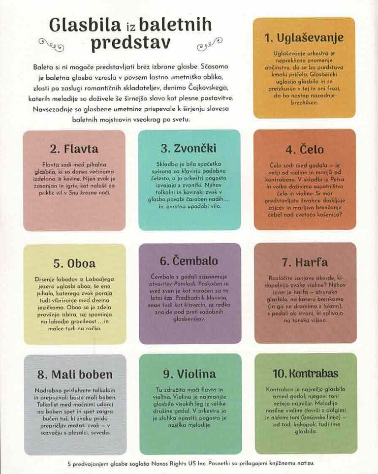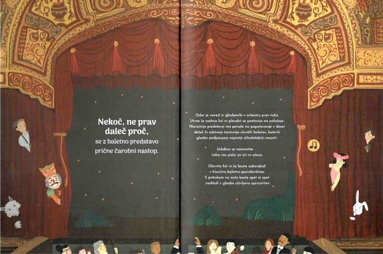 Udobno se namestit, razprite čarobno zvočnico in doživite devet prečudovitih baletnih predstav. Knjiga zvokov najmlajšim v okušanje ponudi svet baletne umetnosti. V dvoje odkrijte čudežnost Sna kresne noči, žalobnost Labodjega jezera in očarljivost Hrestača. Na desetih ilustracijah vselej spet najdete gumb z noto, ki ob pritisku zazveni. Glasbeni izsek iz izbrane baletne predstave vas popelje na čarno potovanje. Preberite več