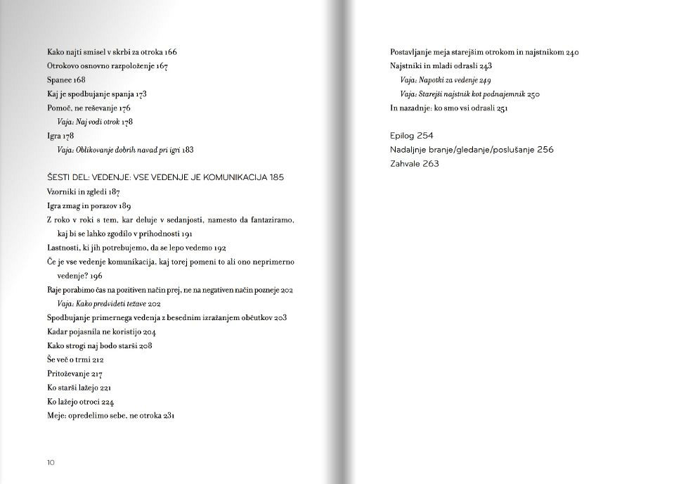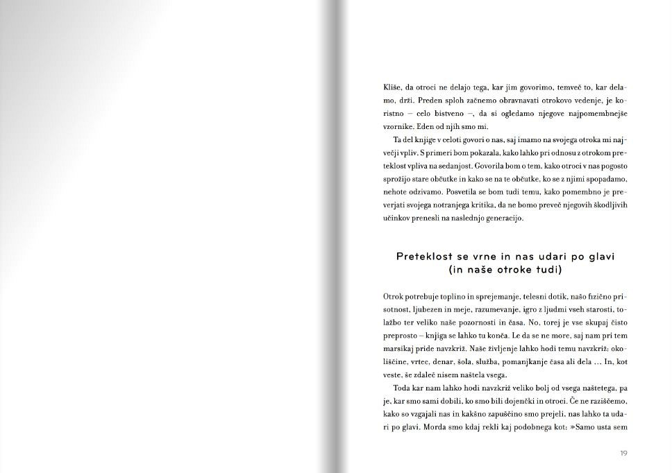 V knjigi nam avtorica namesto »popolnega« načrta razgrinja širši pogled na starševstvo. Posveča se temu, kaj je resnično pomembno za dobro medosebno povezanost, kaj jo lahko izboljša, kakšnemu vedenju se je bolje izogniti in kaj lahko na¬redimo, da bomo otroku pomagali biti oseba, kakršna je lahko.