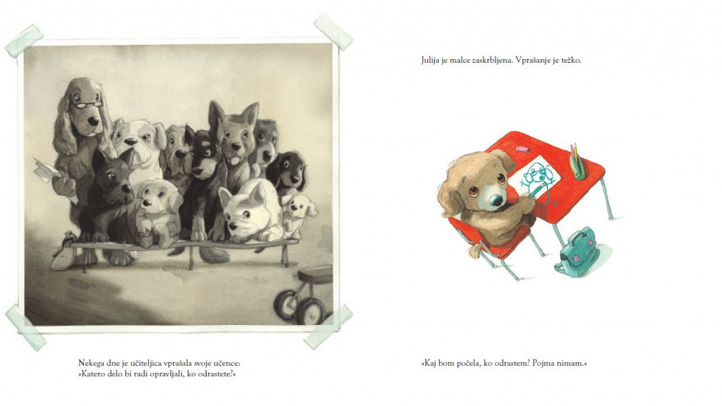 Učiteljica v šoli vpraša učence, katero delo bi radi opravljali, ko odrastejo. Nekateri se že vidijo v vlogi sprevodnika na vlaku, morda zdravnice ali policista. Sanj je veliko! Le Julija je zaskrbljena, saj ni povsem prepričana, da že pozna odgovor na to težko vprašanje. Preberite več