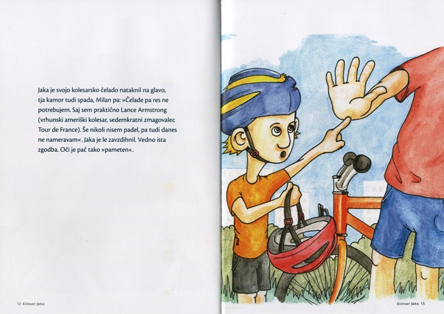 Jaka je bil več kot navihan fantič. Z mamico in očkom so živeli v starejši obnovljeni vili sredi Ljubljane. Mamica je bila večino dneva v službi, oči pa je imel kar veliko prostega časa. Nekatere službe se pač opravlja v večernih in nočnih urah. Tako je imel naš dečko kar srečo. Zjutraj ga je oči sicer odpeljal v vrtec, le da tam nikoli ni ostal dlje kot do kosila. Nekega lepega dne pa sta šla Jaka in očka Milan na kolesarjenje. Zgodba se je zapletla pri uporabi čelade.Trda vezava, 21,5 x 30 cm, 23 strani.