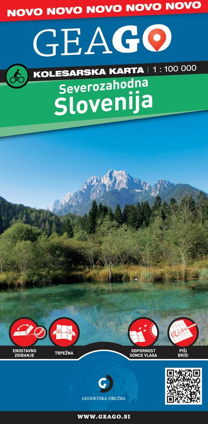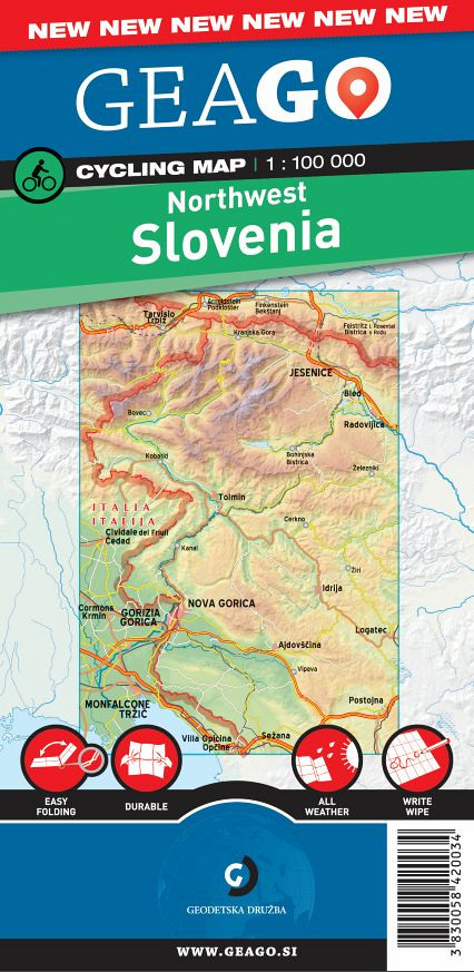 Kolesarska karta s turističnim vodnikom - SZ Slovenije (GeaGo).Merilo: 1 : 100 000Material: laminirana kartaZložen format: 11 x 24 cm