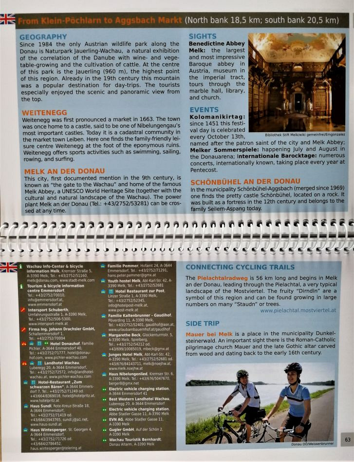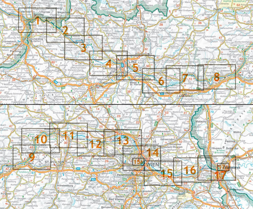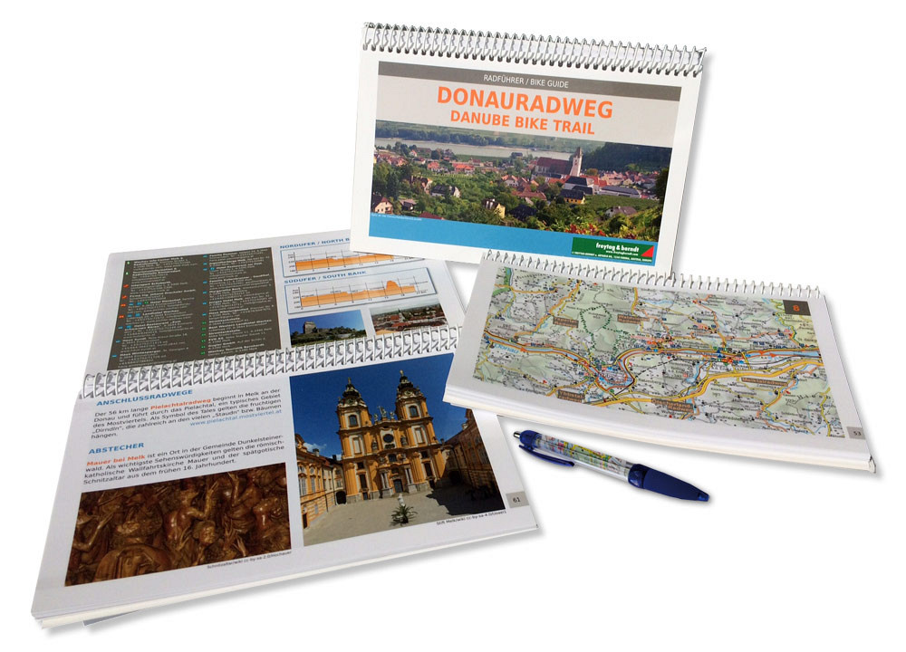 Zemljevid Kolesarske poti ob Donavi v merilu 1:125.000 predstavlja pot Passau - Dunaj - Bratislav. Poti so podrobno opisane na ravni težavnosti, dolžine, zahtevnosti in časa potovanja.Posebej so zabeležene zanimivosti, naravne lepote in tudi pohodniške poti. Preberite več