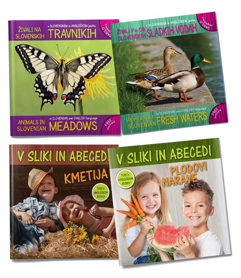 Komplet štirih poučnih didaktičnih knjigic preko katerih bodo vaši malčki spoznavali naravo, živali ter osnove angleškega jezika. V kompletu najdete knjigici iz zbirke V SLIKI IN ABECEDI (Kmetija in Plodovi narave) ter ŽIVALI NA SLOVENSKIH... (Travnikih in ob sladkih vodah)!