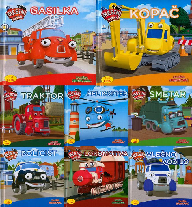 Zbirka Mestni junaki vsebuje osem zgodb o gasilki Gasji, policistu Poldiju, helikopterju Heloju, traktorju Timotu, itd.