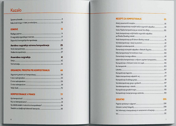 V prvem delu se spustimo v samo razdelitev procesov razgradnje organskega materiala, kot v kakšni kuharski knjigi, ko so najprej predstavljanje teoretične tehnike dela in potem v drugem delu nadaljujemo z najbolj pogostimi recepti za kompostiranje na malo in veliko.