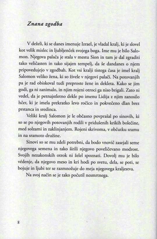 Z nagrado Woutertje Pieterse ovenčani mladinski roman nam odstre prostor, ki trepeče pod modrim in pravičnim, neusmiljenim in krutim kraljem Salomonom. Izvrstno pero nizozemske pisateljice Selme Noort mojstrsko izriše skrivnostno in pustolovsko pripoved, ki z zvoki trstene piščali zareže v daljni čas.