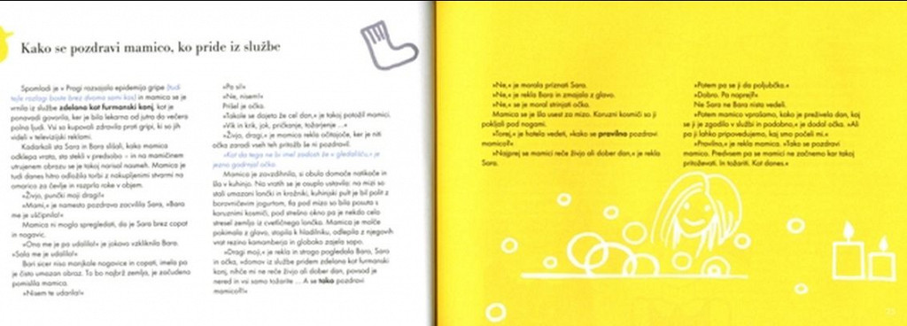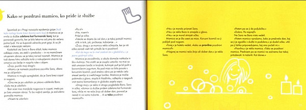 Vse zgodbe v tej knjigi pa se da prebrati v desetih minutah in napisane so tako, da se starši ob njih ne dolgočasijo – nekateri odstavki, natisnjeni v modri barvi, so namreč namenjeni samo njim.