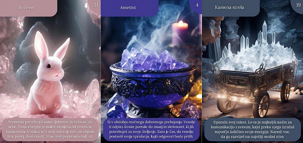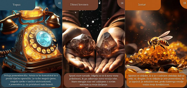 Kakšni so namigi vesolja zate, kateri kristali želijo delati s tabo, kaj je pomembno, da veš o sebi …? Vse to in še več te čaka takoj, ko primeš karte, jih prosiš za vodstvo, premešaš in nato dovoliš, da se ti razkrije … prava.