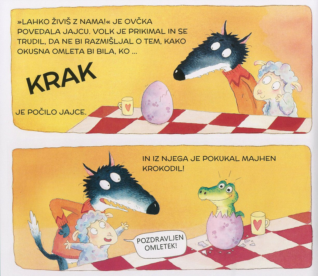 Neke temne noči sta ovčka in volk našla veliko jajce. »Krokodil« so zavpile gozdne živali, ko je ta pokukal iz jajca. Toda ovčka in volk nista bila zaskrbljena. Morda resnična nevarnost tiči v tem, da knjigo sodiš po platnicah.....VELIKE TISKANE ČRKE.Trda vezava, 27 x 23,5 cm, 24 strani.