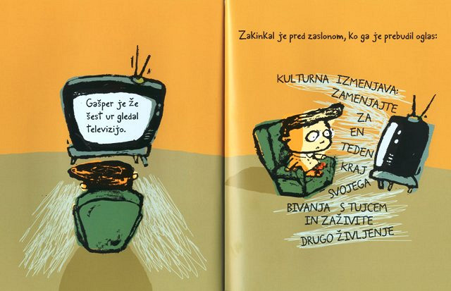 Ko je Gašper nekega dne že skoraj zaspal pred televizorjem, ga je pritegnil oglas:Zamenjajte za en teden kraj svojega bivanja in zaživite drugo življenje! Tako je prišel slon Bombo v mesto gledat televizijo, Gašper pa je preživel čudovit teden v afriškem pragozdu.Knjiga je oblikovana v skladu s priporočili za oblikovanje gradiv za bralce z disleksijo, vsebuje didaktične materiale in je napisana v španskem in slovenskem jeziku Preberite več