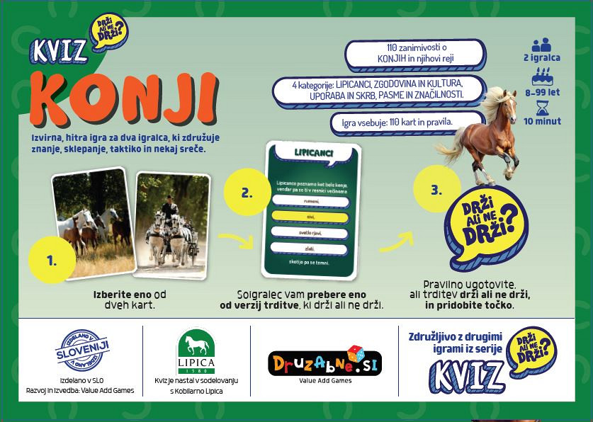 Igra je primerna tako za otroke kot odrasle ljubitelje konj. Skozi igro boste spoznali zanimivosti o pasmah, obnašanju konj in zgodovini Lipice. Zaradi kompaktne velikosti je igra odličen spominek ali darilo, ki ga lahko vzamete s seboj na pot.