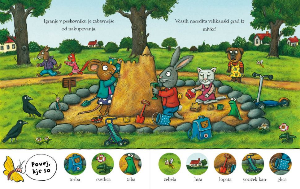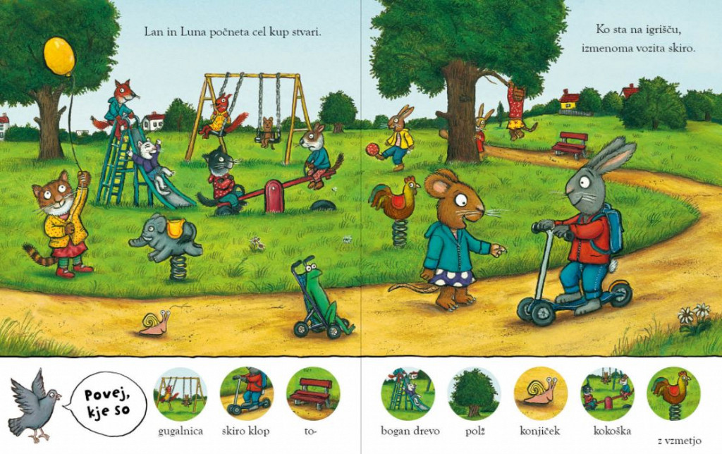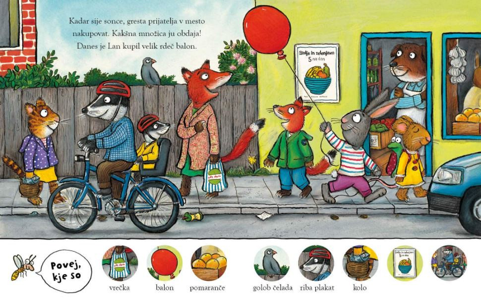 Poglejte predmete na dnu strani, poiščite jih na ilustracijah in jih imenujte.