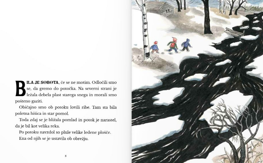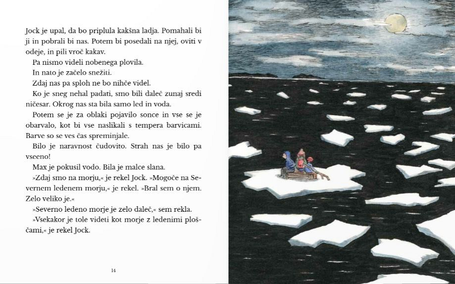 Pustolovska zgodba, posvečena raziskovalcem polarnega območja. Ida, Max in Jock se nekega zgodnjega pomladnega dne odpravijo k potoku. Igrajo se na ledeni plošči, naenkrat pa jih odnese in znajdejo se v polarni pokrajini, le z zabojem, vejo in nekaj sendviči.