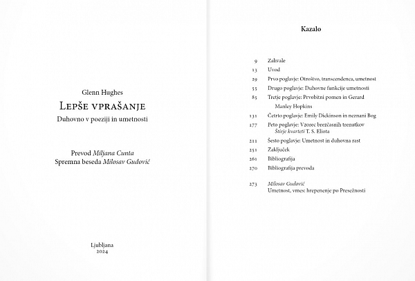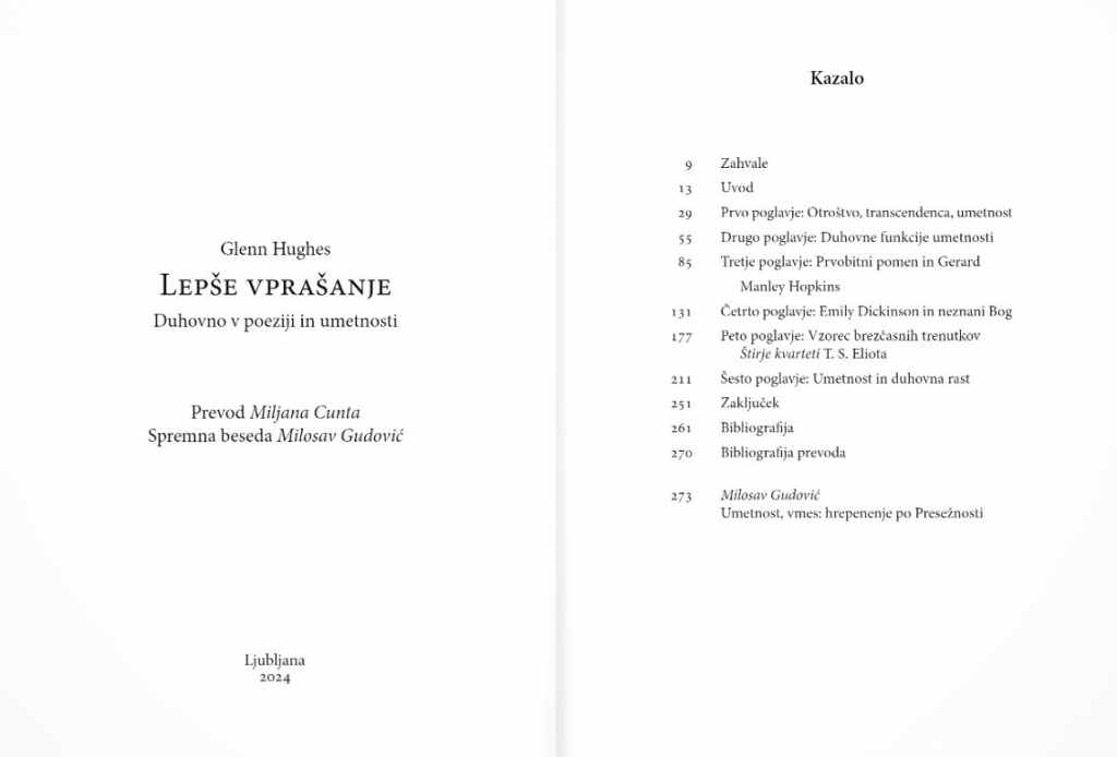 Naslov knjige Lepše vprašanje si avtor Glenn Hughes izposodi od E. E. Cummingsa, ki je o umetnosti zapisal, da je to »vselej lep odgovor, ki postavi še lepše vprašanje«. Ta pesniška definicija zgoščeno povzema osrednjo misel knjige, da je vsa velika umetnost človekov odgovor na vprašanje bivanja v vmesnosti med imanenco in transcendenco, kot taka pa tudi sama pomensko odprta in nikoli do konca razpoložljiva.