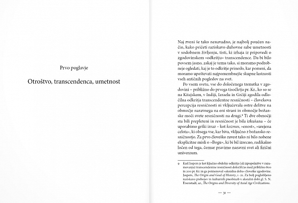 Ob različnih funkcijah, ki jih ima umetnost danes – lahko zabava, sprošča, navdihuje, razkriva nove možnosti mišljenja –, avtor izpostavi njeno duhovno razsežnost kot posebej plemenito in najbolj daljnosežno. Čeprav je za današnji čas značilna »kriza vere«, v človeku še vedno živi stremljenje po presežnem, ki ga lahko poteši prav umetnost in še posebej poezija kot najbolj natančen izraz čustvenih in eksistencialnih občutij smisla.
