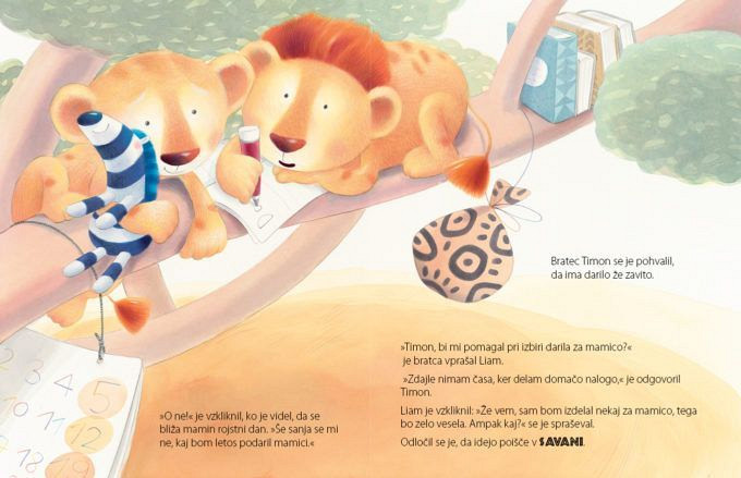 V afriški savani je živela levja družina. Najmlajši levček, Liam, je želel svoji mamici za rojstni dan podariti nekaj posebnega. Za nasvet je vprašal žirafo, povodnega konja, noja, šimpanza, slonico, a noben predlog mu ni bil všeč. Močno je napel možgane in s pomočjo očka in brata mamici pripravil darilo.