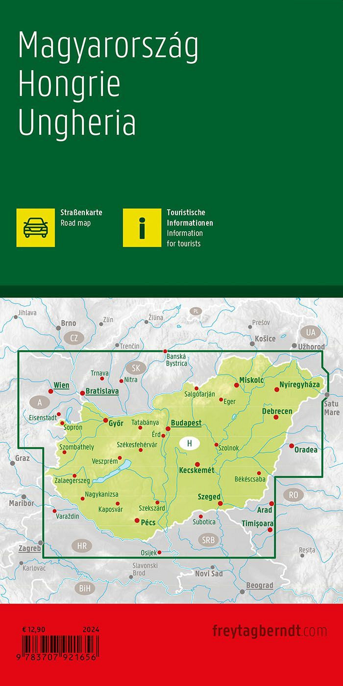 Na avtokarti Madžarske v merilu 1:400.000 je na voljo še veliko dodatnih informacij: turistične znamenitosti, nacionalni parki, kampi, kolesarske steze in zemljevidi različnih mestnih središč (Budimpešta in Debrecen). Preberite več