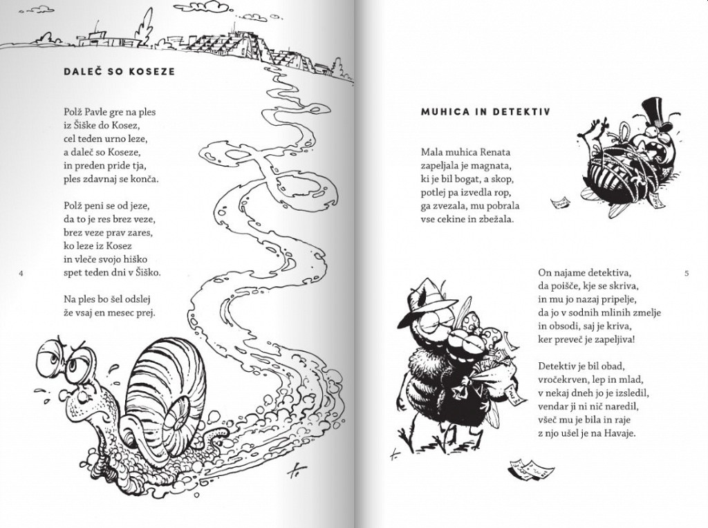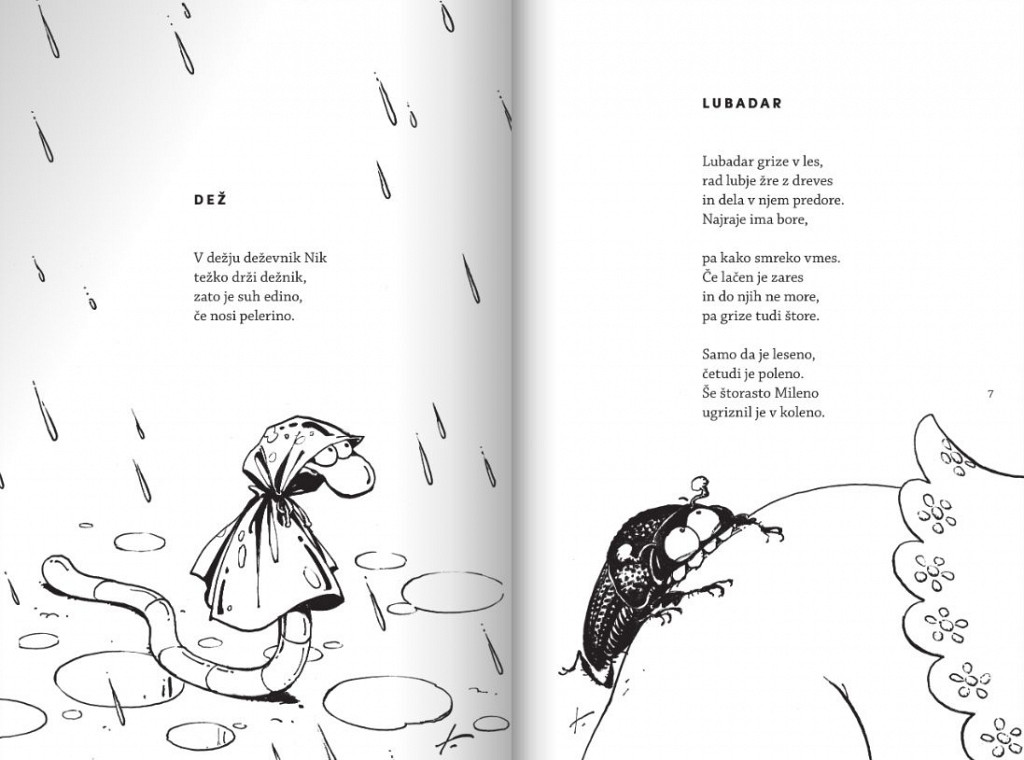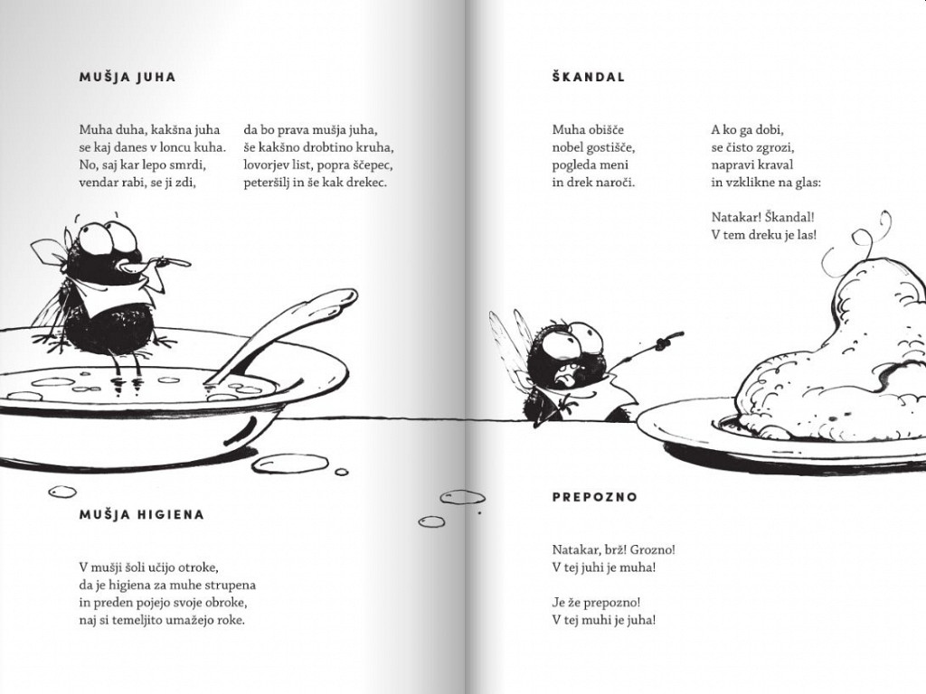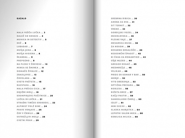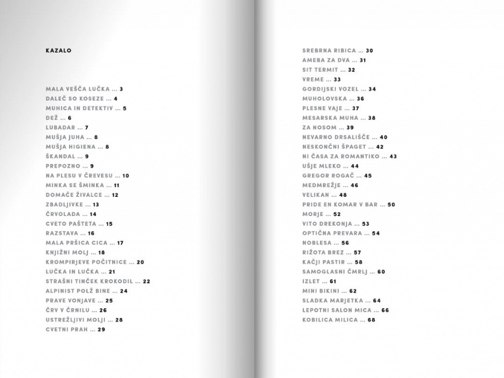 Po megauspešni prvi zbirki ilustriranih pesmic Mali črv Oto sta se Lovro in Tomaž lotila še ene knjige o žužkih – tudi tu migetajo raznorazni hrošči in mravljinci, pa muhe v juhi in bolhe na psu, črvi na morju, pajki na internetu, polži na plesu in kobilice na modni pisti, vsak s svojimi malimi križi in težavami v velikem svetu okrog njih. To so zgodbe za otroke in odrasle in tiste vmes. Nekaterim se bodo zdele duhovite, drugim poučne, tretjim pa morda samo trapaste.