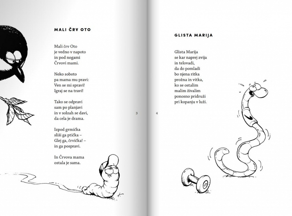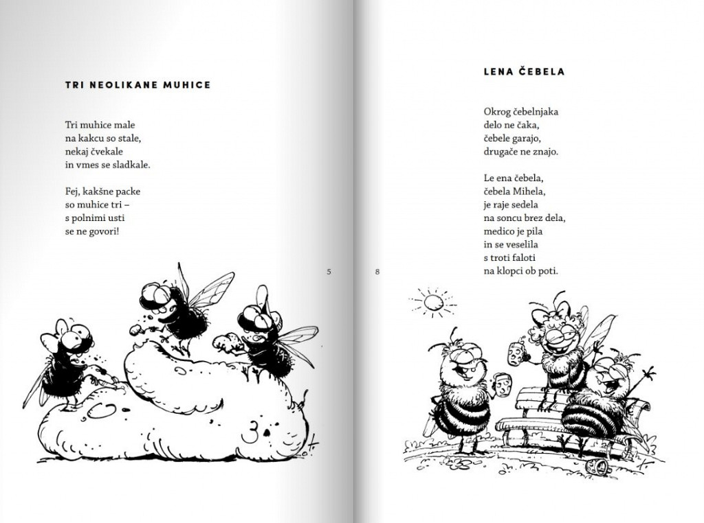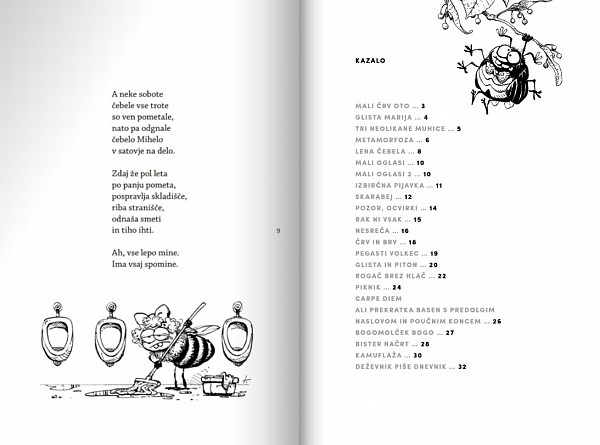 Tu so še polži, ki pišejo oglase, glista Marija, ki se kar naprej zvija, mali krt Črt, ki ima bister načrt, ne manjkajo seveda tudi štiri črne mravljice, pajek Aljaž, pegasti volkec, lena čebela Mihela in deževnik, ki piše dnevnik … z eno besedo svet, v katerem mrgoli od življenja, ki nasmeji in zabava z bistroumnimi domislicami, malo pa tudi zbada. Izvrstno ga predstavljajo mojstrske ilustracije – nazorno provokativne in pikro humorne!