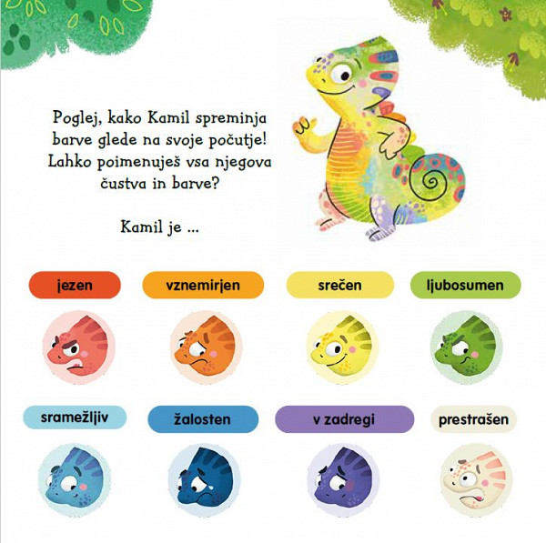 Kameleon Kamil se želi igrati z nekom, ki je točno tak, kot je on sam. A ko ne najde nikogar, čuti celo paleto čustev – in se obarva v vse barve mavrice! Se bo Kamil naučil obvladati svoja čustva? Preberite več