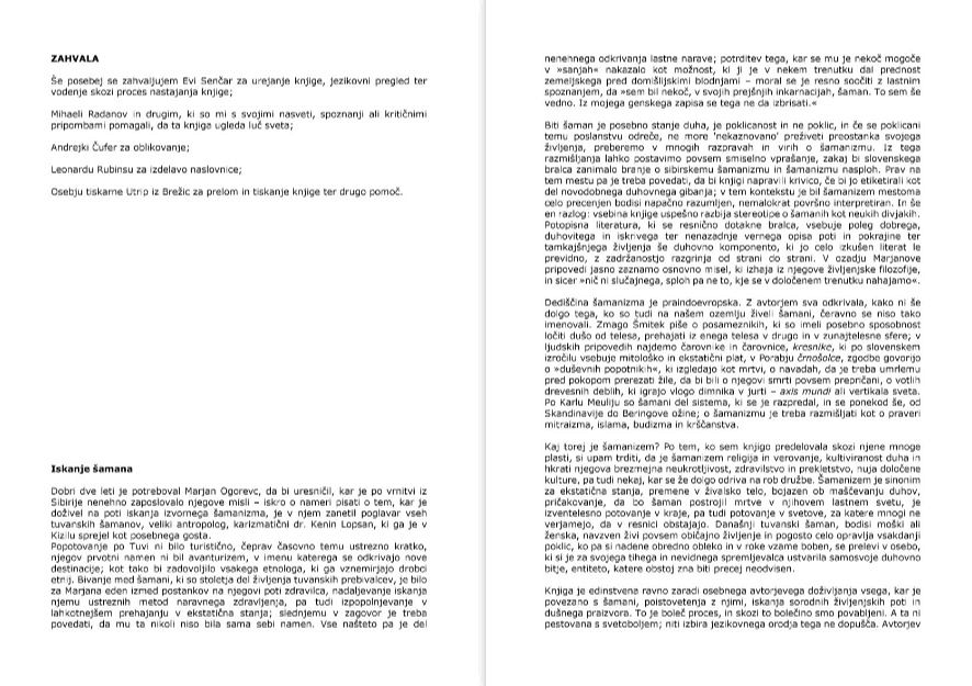 Marjan Ogorevc v knjigi z vami delil dragocene izkušnje, ki jih je pridobil na svojem potovanju v Sibiriji. S pomočjo potopisa se boste naučili, kako ponovno spoznati pozabljeno in ohraniti ravnovesje v vas samih. Gre za svojevrsten potopis o nepredvidljivih in neusmiljenih sibirskih prostranstvih ter oddaljenemu pogledu zanimivega načina življenja šamanov.