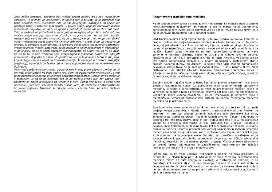 Nespoštovanje narave in njenih zakonitosti za prebivalce pomeni smrt. Šamani že tisočletja igrajo pomembno vlogo pri preživetju in ohranjanju družbe. Ta družbena vloga pa je njihovo življenjsko poslanstvo, ki se mu v celoti posvečajo. Znanje, ki ga ohranjajo in hkrati pridobivajo skozi mnoga življenja, njihova povezanost z duhovi, ki jih obkrožajo, njihova potovanja iz sveta, v katerem živijo, v svet duhov in nazaj, darovanja, zdravilske in prerokovalske sposobnosti jih postavljajo na mesto, ki ga ne morejo zavrniti. Njihova poklicanost je hkrati njihova stigma. Od njih se lahko učimo, ponovno spoznamo pozabljeno in pomagamo ohranjati ravnovesje v nas samih in svetu, v katerem živimo.