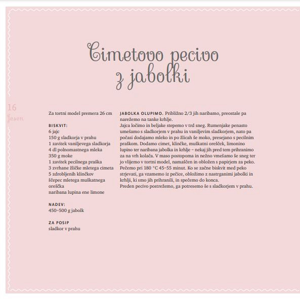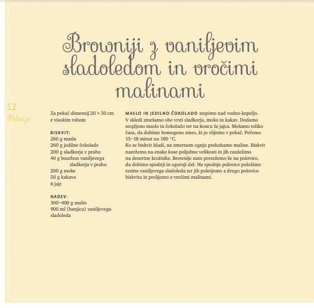 Poleti se osvežimo z rdečim sorbetom ali pehtranovim sirupom, zraven pa se prileže borovničeva ali bananina torta z breskvami, galette s figami, graciozna pavlova ali jogurtova torta z malinami. Navadne čokoladne brownije obogatimo z vaniljevim sladoledom in vročimi malinami, eksperimentiramo s sladkim bučkinim zvitkom. Jeseni pripravimo pito iz muškatne buče, cimetovo pecivo z jabolki, sirup iz najboljše dišečega grozdja jurka, cimetove preste in kakijevo peno ter zapečeno mlečno proseno kašo in pečena jabolka. Zimski mraz preženemo z vročo čokolado z rumom, praznično veselje pa si pričaramo s cimetovimi zvezdicami, ingverjevimi piškoti, ajdovo medeno potico, pitvansko torto ter z oreščki in suhim sadjem bogato zimsko pito. Ob odličnih fotografijah Neže Reisner se nam pocedijo sline in nas zasrbijo prsti, da se ne glede na letni čas preizkusimo v ustvarjanju bolj ali manj zapletenih sladkih umetnin.