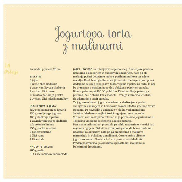Za ščep okusnih sladkih dobrot, ki zahtevajo nekoliko več spretnosti, pa se vsekakor velja potruditi. Spomladi se lahko poskusite v ustvarjanju jagodne sladice s kokosom, poleti borovničeve torte, jeseni kakijeve pene in pozimi rožičevega peciva. Vsak recept je obogaten s fotografijo izpod objektiva Neže Reisner.