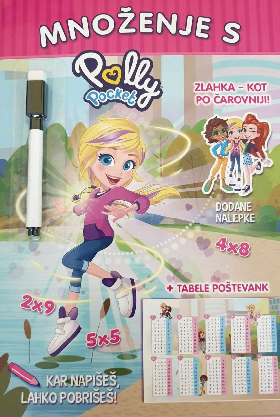 Množi in deli z lahkoto - kot po čarovniji! Ker se da strani do čistega obrisat, lahko s flomastrom vadiš, kolikorkrat hočeš. Dodane nalepke + tabele poštevank.