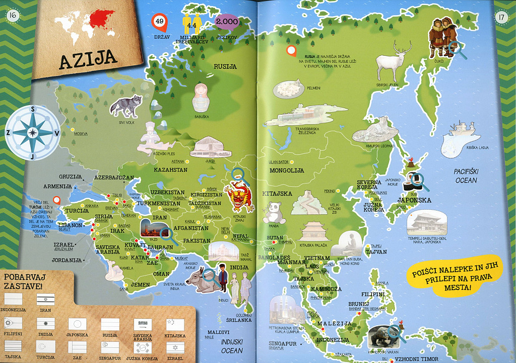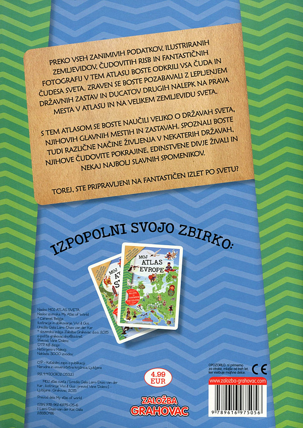 Preko vseh zanimivih podatkov, ilustriranih zemljevidov, čudovitih risb in fantastičnih fotografij v tem atlasu boste odkrili vsa čuda in čudesa sveta, zraven se boste pozabavali z lepljenjem državnih zastav in ducatov drugih nalepk na prava mesta v atlasu in na velikem zemljevidu sveta. Preberite več