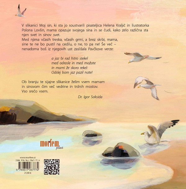 ZBIRKA ZA VSE GENERACIJE! Moj sin, slikanica, ki sta jo soustvarili pisateljici Helena Kraljič in ilustratorka Polona Lovšin. V njej mama opazuje svojega sina in se čudi, kako zelo različna sta njen svet in sinov svet. Med njima včasih treska, včasih grmi, a brez skrbi, mama, sine te ne bo pustil na cedilu, o ne, to pa ne! Preberite več
