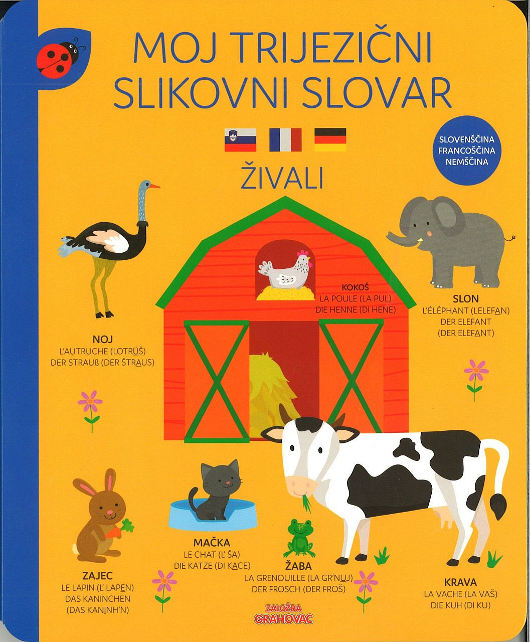 V tem slikovnem slovarju bo vaš otrok spoznal številne živali. Vsako ilustracijo spremlja poleg slovenske še ustrezna beseda v dveh jezikih, francoščini in nemščini, s poenostavljeno izgovorjavo v oklepaju. Preberite več