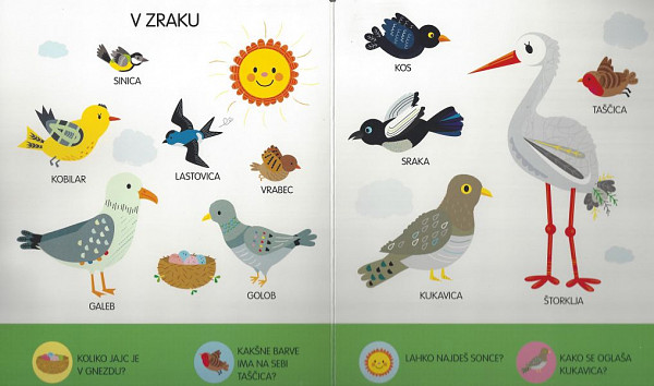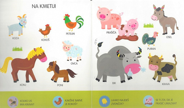 Na spodnjem delu vsake strani so štiri preprosta in zabavna vprašanja, ki bodo spodbudila vašega otroka k štetju, prepoznavanju barv, iskanju in odkrivanju novih pojmov.