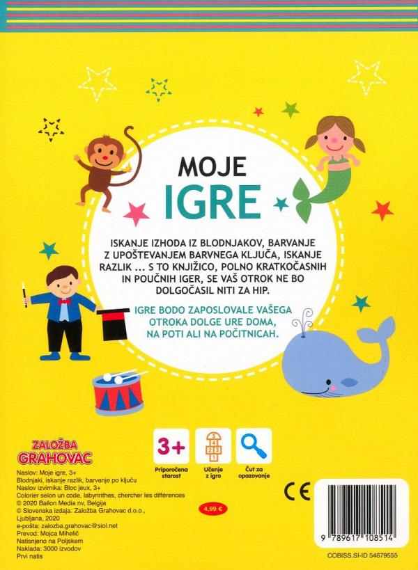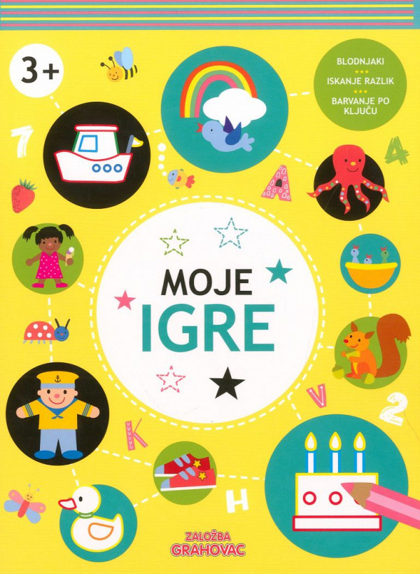 Moje igre za otroke starejše od 3 let. Iskanje izhoda iz blodnjakov, barvanje z upoštevanjem barvnega ključa, iskanje razlik ... s to knjižico, polno kratkočasnih in poučnih iger, se vaš otrok ne bo dolgočasil niti za hip. Preberite več