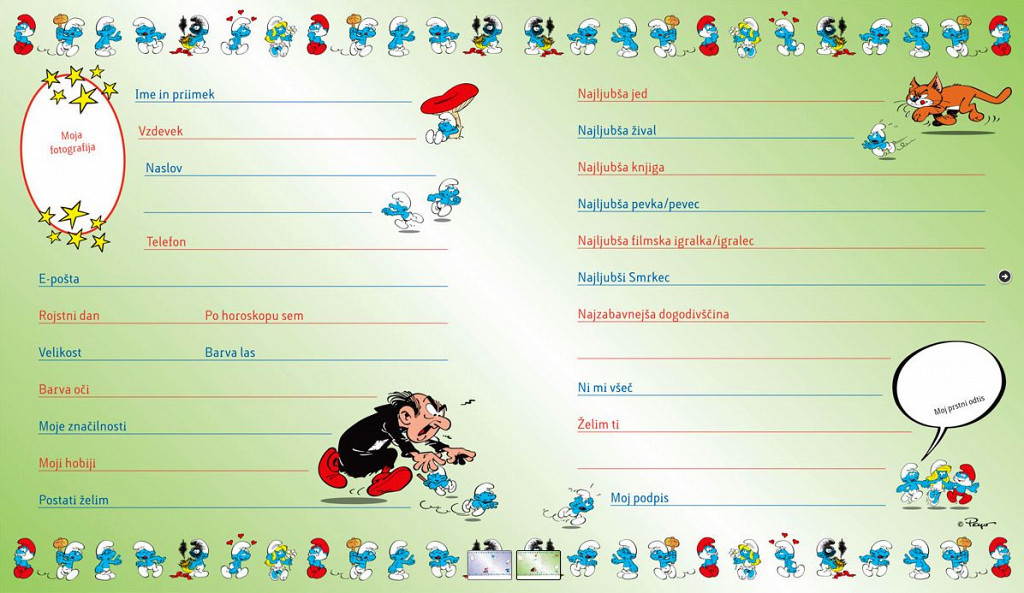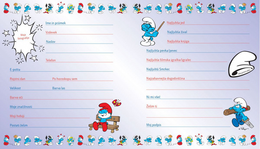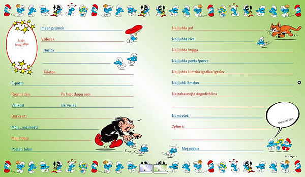 Tako se boste bolje spoznali in se imeli še raje. Na koncu knjige te čaka tudi koledar in tako ne boš nikoli več zamudil rojstnih dni svojih prijateljev in njihovih zabav. Veliko strani za smrkastične fotografije, podatke, želje in prstne odtise.