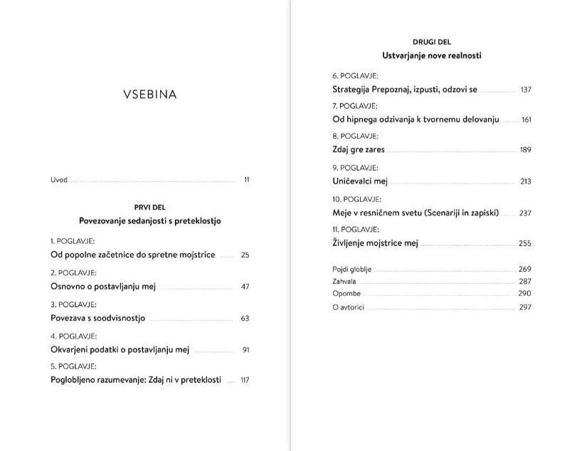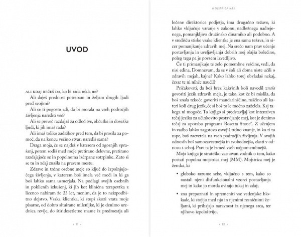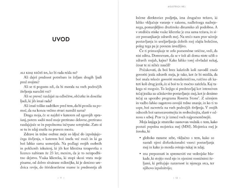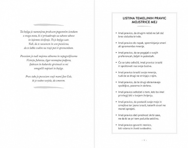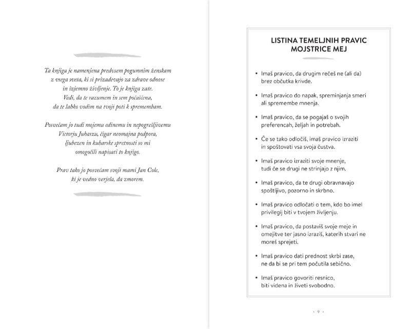 Boljša komunikacija, boljši odnosi ter več zadovoljstva, obilja in uspeha. Psihoterapevtka Terri Cole pri pisanju knjige izhaja iz preproste, a ključne domneve, da brez zdravih meja ne morete živeti pristno in izpolnjeno. To še posebej velja za današnje ženske, ki so pogosto razpete med kulturološko pogojeno zahtevo po »prijaznosti« in potrebo po zaščiti svojega lastnega dobrega počutja. Zato Terri predstavlja Mojstrico mej, celovit vodnik za ženske, ki želijo obvladati vzpostavljanje in ohranjanje zdravih meja.