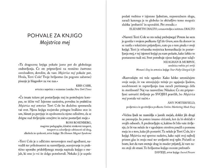 »V knjigi Mojstrica mej vam zdraviteljica in transformacijska terapevtka Terri Cole ponudi psihološko učinkovito zdravilo, ki ga potrebujete, da bi se znebili uničujočih navad, prenehali ugajati ljudem in osvobodili svojo dušo.« - Gabrielle Bernstein, avtorica uspešnice Vesolje vas podpira