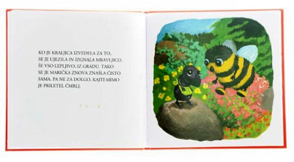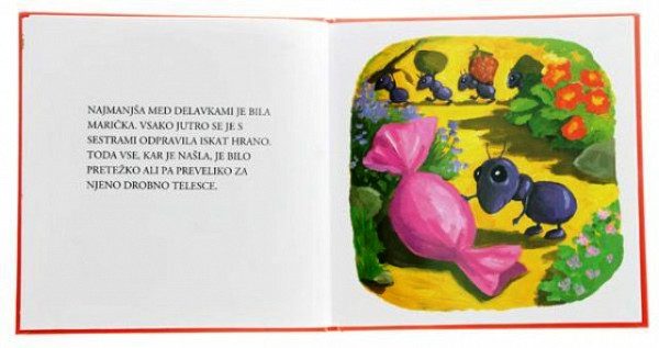 Marička je najmanjša in najšibkejša izmed mravljic. Zato jo iz domačega mravljišča naženejo. Med samotnim popotovanjem se ji zgodi veliko neprijetnosti. Na koncu pa Marička vendarle najde prijazno in mehko zavetje v cvetu vrtnice.Zelo ekspresivne ilustracije pomagajo otrokom razvijati občutek za umetnost in barve. Knjižice imajo zelo primeren format in otroci jih z lahkoto prelistavajo. Knjižice so namenjene otrokom od 3 do 7 let, ker pa skrivajo v sebi veliko humorja in tudi kakšno ost jih z zanimanjem preberejo tudi odrasli.Trda vezva, 19,5 x 20 cm, 24 strani. Preberite več